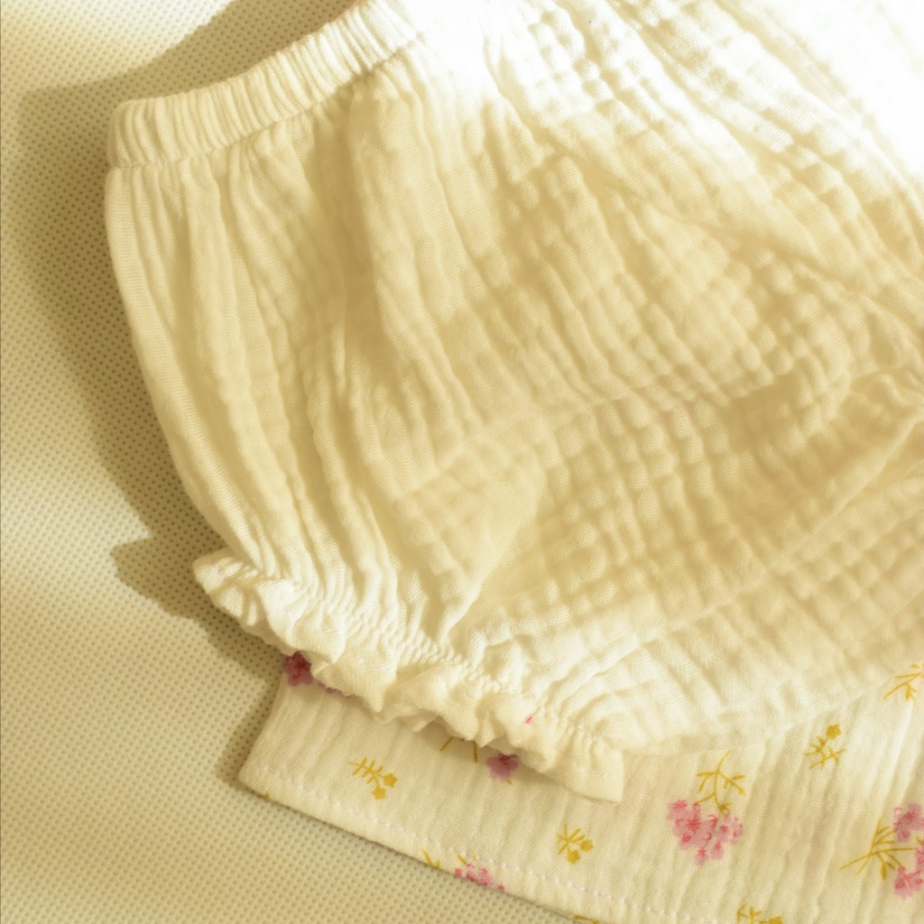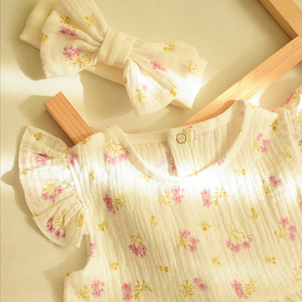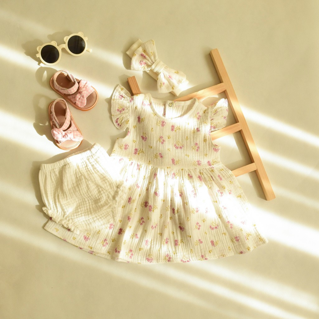 سِت سه تیکه نوزادی موسیلین( پیراهن ، شورت و هدبند )